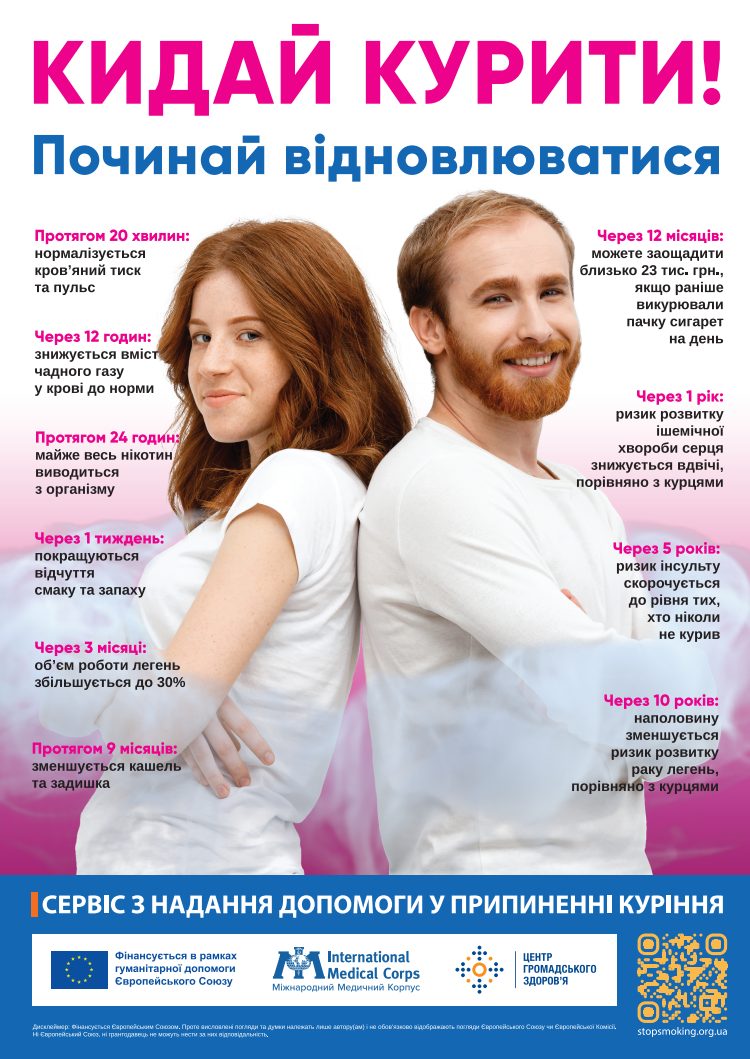 - Скористайтеся допомогою фахівців — безкоштовний сервіс припинення куріння: СКАНУЙТЕ QR НА ЗОБРАЖЕННІ або перейдіть на сайт, вказаний на постері.