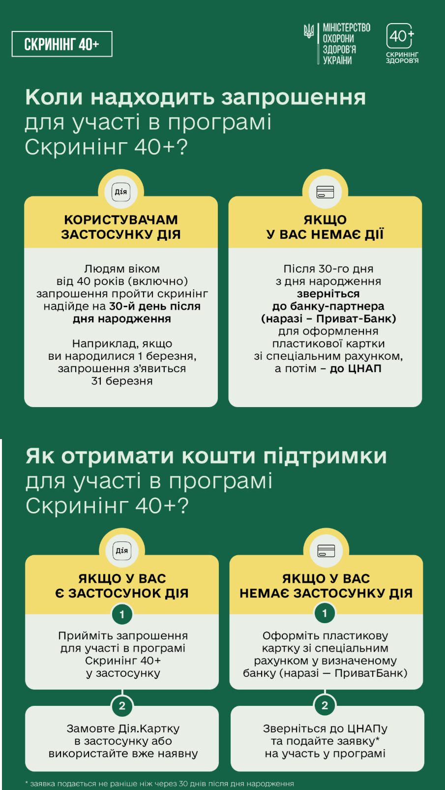 - Запрошення на скринінг надходитиме в застосунок Дія на 30-й день після дня народження — для людей віком від 40 років і більше.